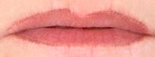 Bei unsachgemäßer Behandlung entsteht z. B. folgendes Ergebnis: Ungleichmäßige Konturen, die durch zu helle und zu dunkle Farbeinlagerungen (zuerst wurde eine zu helle Farbe verwendet und dann eine zu dunkle) sowie durch ungleichmäßig starken Druck und zu langes Verweilen der vibrierenden Nadel auf einer Hautstelle entstehen. Zuerst deckte ich die aus der Form geratene Linie und die unschönen dunklen Stellen ab und zeichnete dann mit einer zum eigenen Lippenton passenden Farbe eine gleichmäßige Kontur mit leichter Anschattierung (farbliche Auffüllung des Übergangsbereichs, damit kein „Strich“-Effekt ensteht). Diese Kundin wünschte sich ein zwar wirkungsvolles, aber dennoch natürliches Lippen-Permanent Make-up, das ihren Typ nicht allzu sehr verändert.
